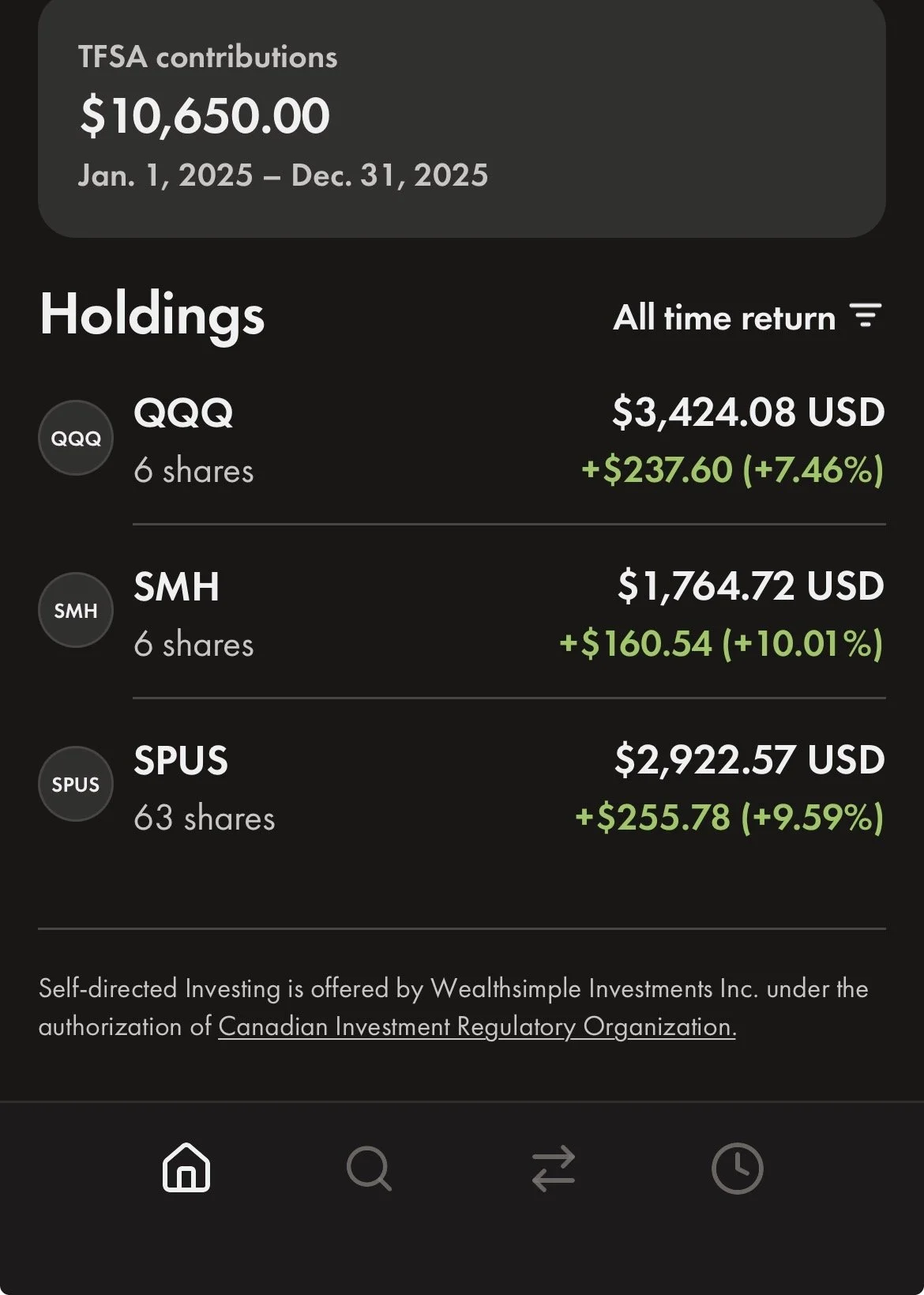 Wealthsimple TFSA portfolio screenshot showing holdings in QQQ, SMH, and SPUS ETFs with positive returns.