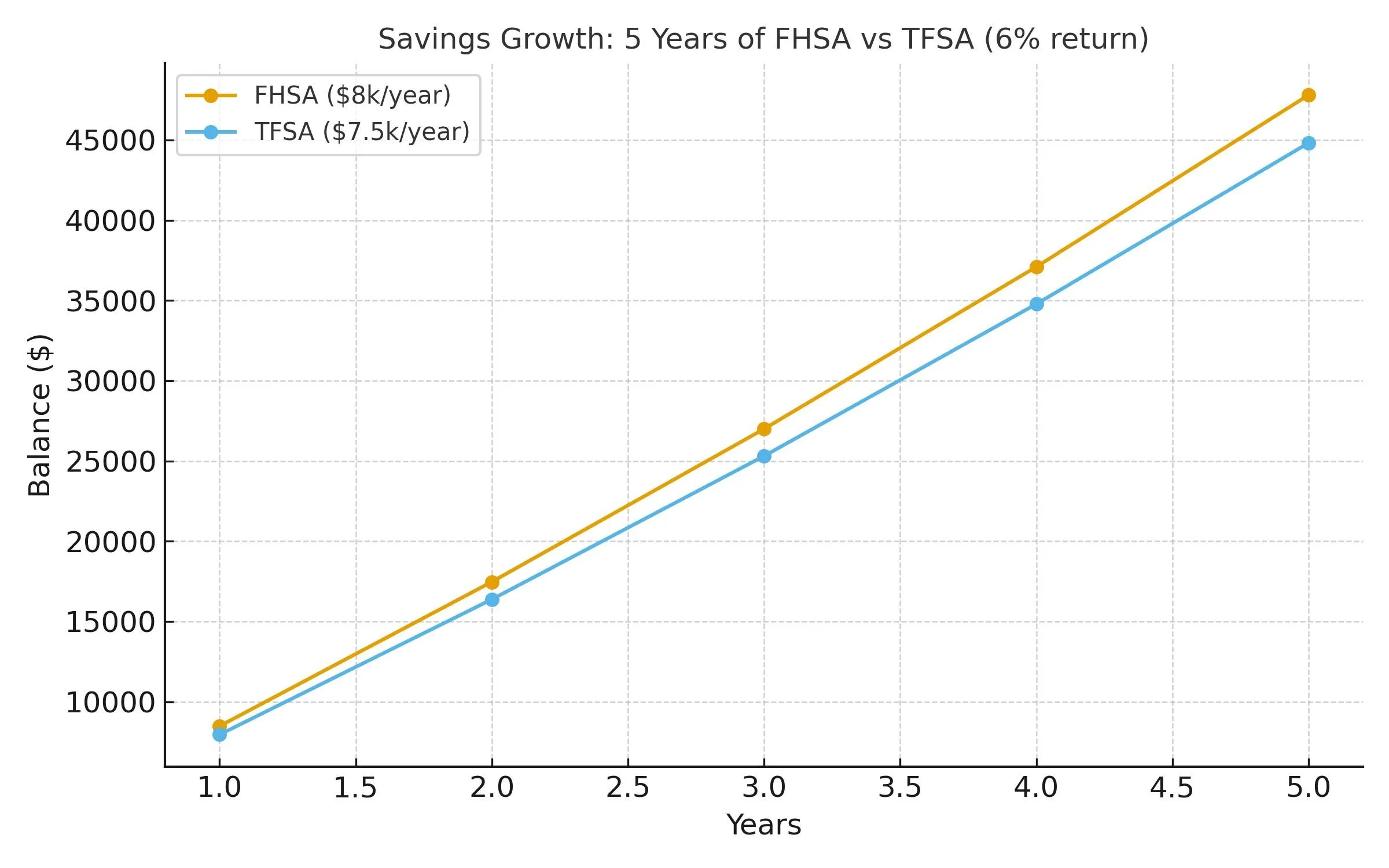 Five years of consistent contributions. FHSA edges ahead slightly, but both accounts build serious momentum.